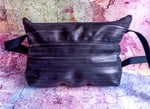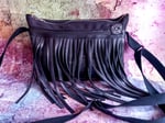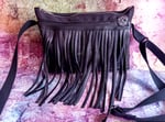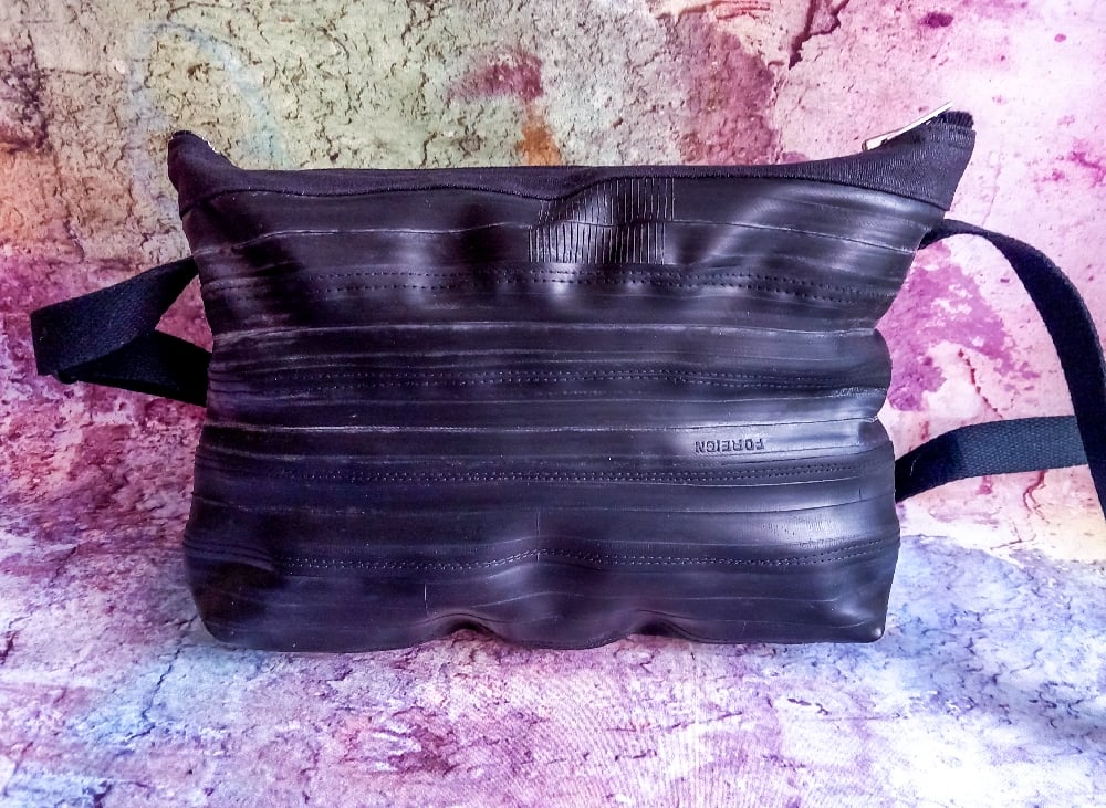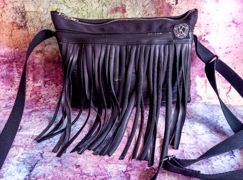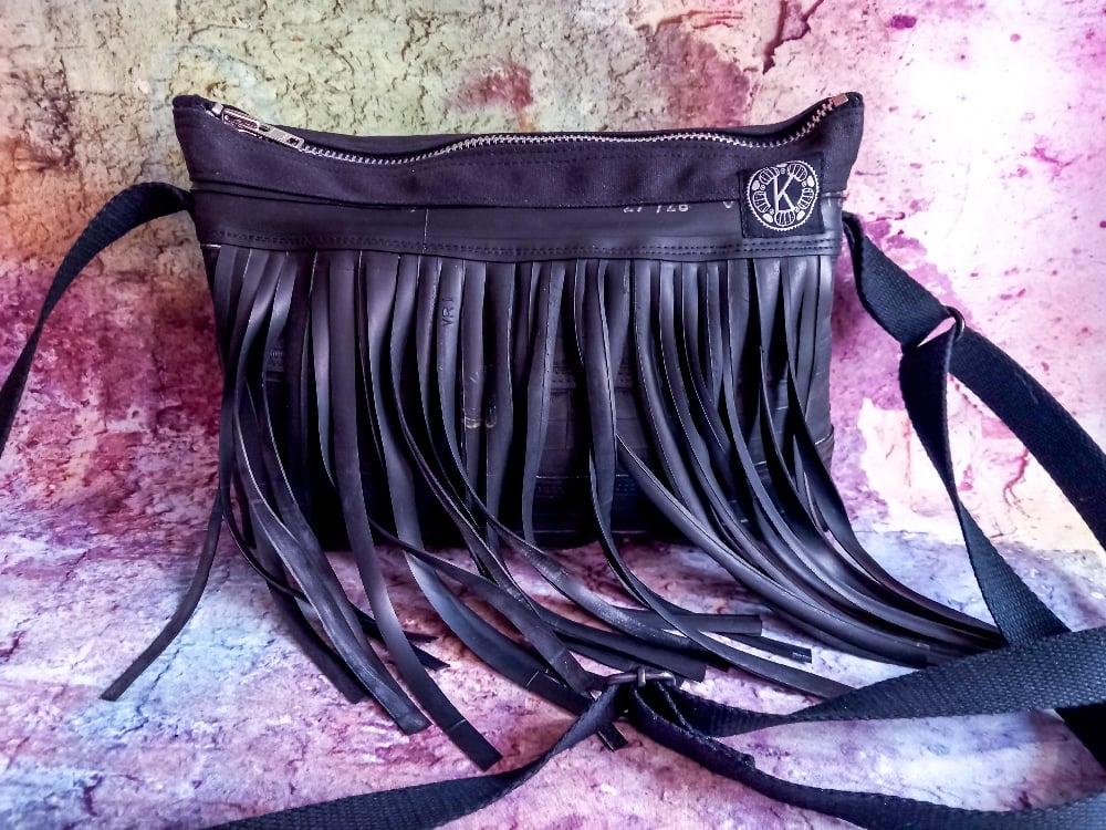 This crossbody bag is made out of reclaimed rubber of bike inner tubes and has innertube fringe detail on the front.