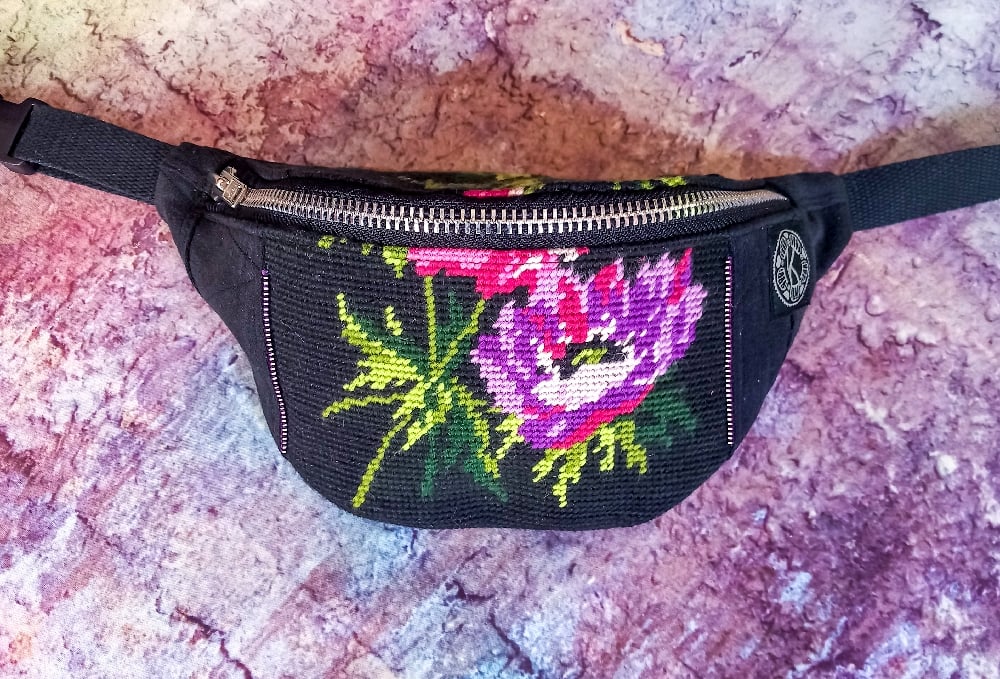 It's made out of beautiful vintage floral tapestry mixed with black denim and it has cotton canvas lining.