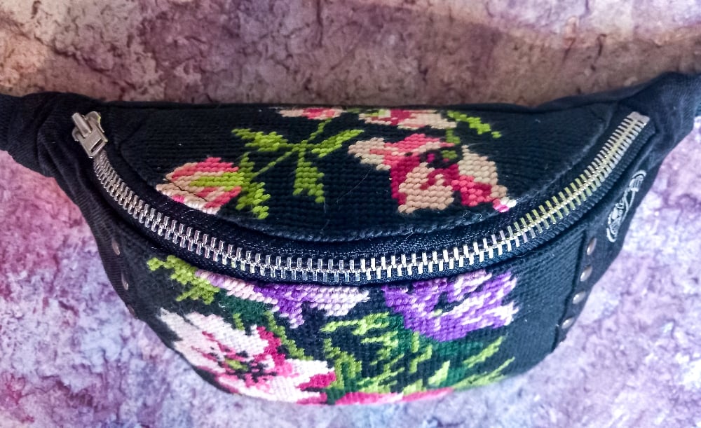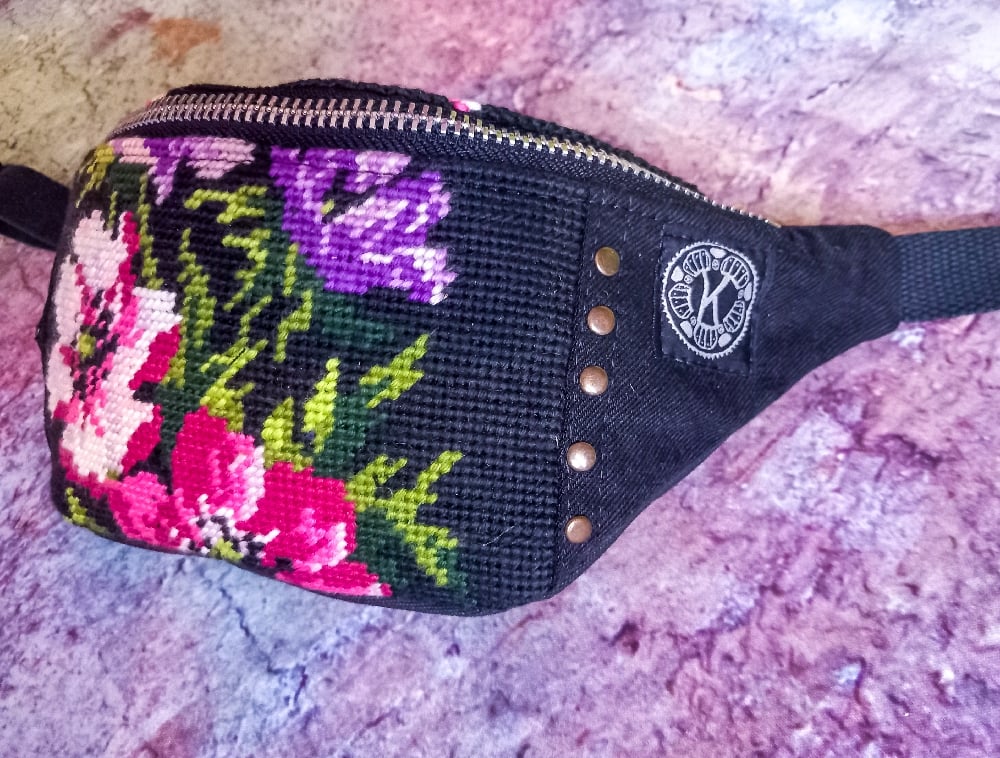 It's made out of beautiful vintage floral tapestry, rivet details and mixed with black denim and it has cotton canvas lining.