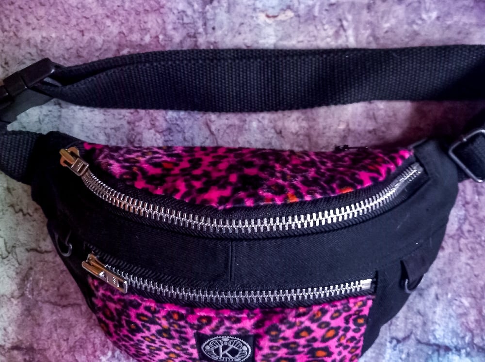 It's made out of leopard faux fur, denim offcuts and it has cotton canvas lining.